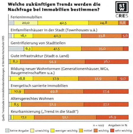 Neben allgemeinen wirtschaftlichen Entwicklungen wurden auch die großen immobilienwirtschaftlichen Trends z. B. hinsichtlich der Energieeffizienz untersucht. So wird durch das kürzlich von der Bundesregierung verabschiedete Energiekonzept deutlich, dass kein Weg an einer energieeffizienten und umweltfreundlichen Zukunft vorbeiführt. Handeln ist auch dringend erforderlich: Lag der Preis für ein Barrel Rohöl im Jahre 2002 noch bei rund 25 Dollar, sind es im Juni 2011 bereits 110 Dollar. Innerhalb weniger Jahre hat sich der Preis also mehr als vervierfacht. Dadurch verteuert sich auch der Betrieb von Immobilien, der 40 Prozent des nationalen Primärenergieverbrauchs verursacht. Durch die Einführung der Verordnung über einen energiesparenden Wärmeschutz bei Gebäuden wurde eine gesetzliche Grundlage für die Errichtung von Energie einsparenden Gebäuden geschaffen. Von den derzeit rund 40 Millionen existierenden Wohnungen sind über 29 Millionen, das heißt 75 Prozent, vor Einführung des Gesetzes errichtet worden. Viele dieser Wohnungen verfügen nicht über einen ausreichenden Energiestandard, sind energetisch höchst ineffizient und werden an Marktgängigkeit, wenn die Energiepreise weiter steigen, d.h. der Immobilienwert wird sinken.