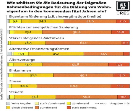 Die Befragten der Trendstudie räumen der Zins- und Einkommensentwicklung den stärksten Einfluss auf die zukünftige Bildung von Wohneigentum ein. Mit 71,2 Prozent folgt unmittelbar die Pflicht zur energetischen Sanierung, die die Bildung von Wohneigentum nachhaltig prägen wird. Potenzielle Käufer von Immobilien müssen zusätzliche Kosten für die energetische Sanierung befürchten beziehungsweise Verkäufer müssen mit Preisabschlägen und damit sinkenden Marktwerten für Objekte rechnen, die energetisch nicht den gesetzlichen Vorgaben entsprechen.